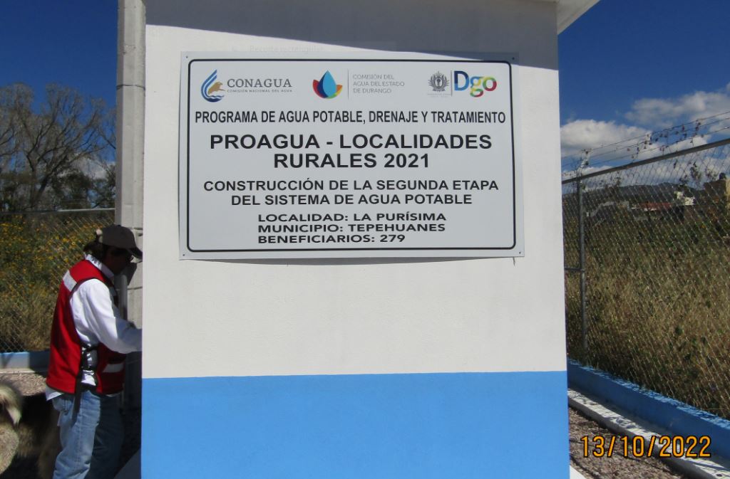 CONSTRUCCIÓN DE LA SEGUNDA ETAPA DEL SISTEMA DE AGUA POTABLE: LÍNEA DE CONDUCCIÓN CON 513.27 M. DE TUBERÍA DE PAD DE 3" DE DIÁMETRO RD-13.5, EQUIPO DE BOMBEO SOLAR Y REHABILITACIÓN DE TANQUE EXISTENTE. LOCALIDAD LA PURISIMA, TEPEHUANES DGO. |
